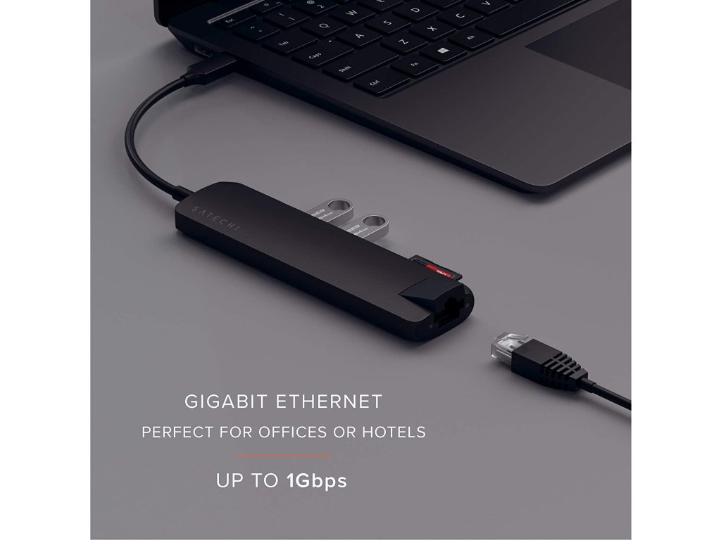 USB-C adaptér Satechi Slim Multiport je malou redukcí, díky které rozšíříte jediný USB-C port na počítači o možnost zapojení externího HDMI monitoru, dvou zařízení s klasickým USB, připojíte síťový Ethernet kabel a přes redukci lze počítač i nabíjet.