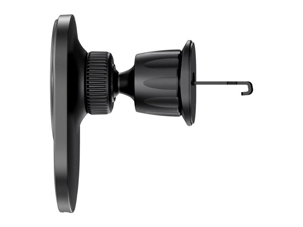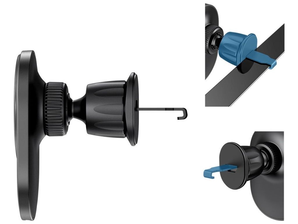 Držák na telefon do auta funguje na bázi magnetů. Telefon na něj pouze položíte. Nemusíte na záda telefonu lepit žádné kovové destičky. Nové iPhony mají magnety integrované v sobě. Na držák můžete umístit iPhone také v pouzdru, které MagSafe podporuje.