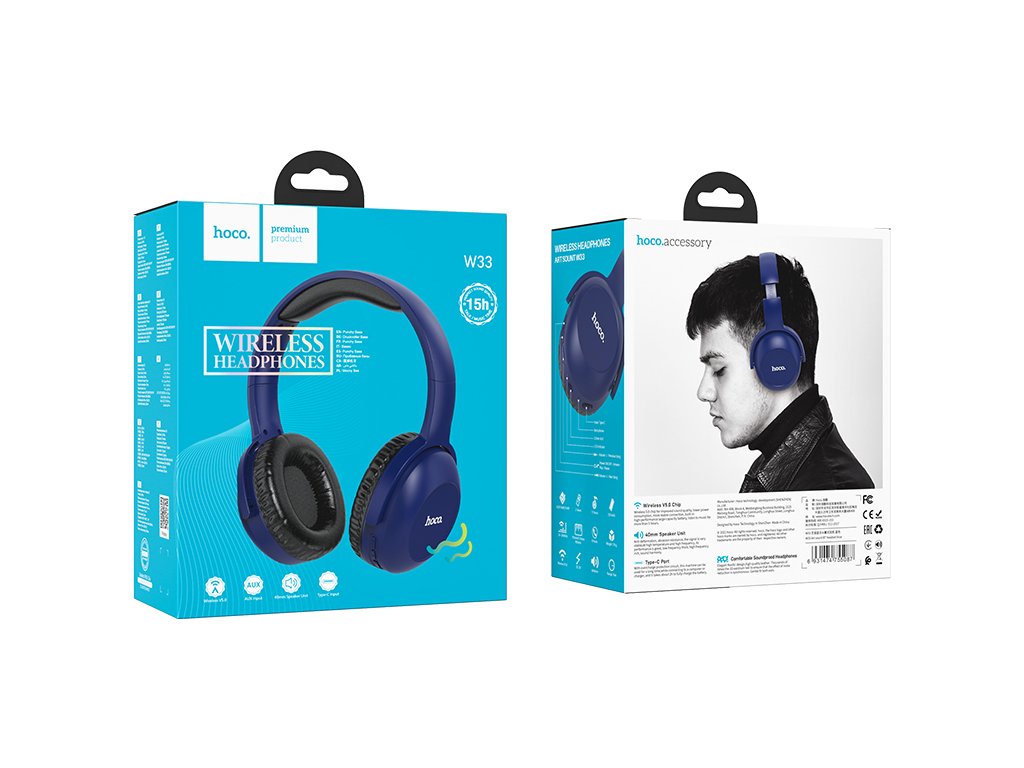 Bezdrátová náhlavní sluchátka Hoco W33 jsou velká a pohodlná sluchátka pro připojení k přehrávači pomocí Bluetooth. Disponují velkou výdrží baterie a nízkou hmotností. Přehrávat můžete ale také hudbu z připojeného zařízení díky sluchátkovému jack kabelu.