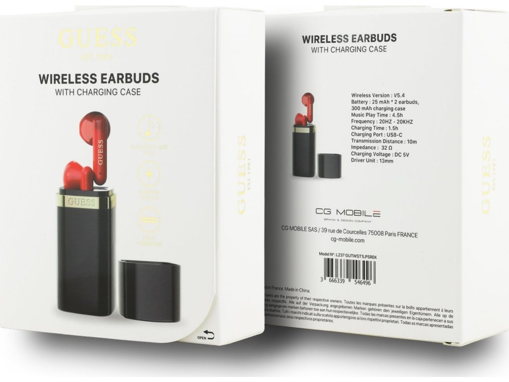 • Stylové nabíjecí pouzdro: Elegantní nabíjecí pouzdro s logem Guess stylizované do tvaru rtěnky nejen chrání sluchátka, ale také je udržuje plně nabitá. Pouzdro je kompaktní a snadno se vejde do kapsy nebo tašky.