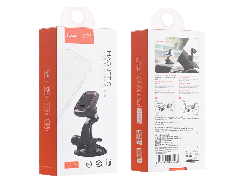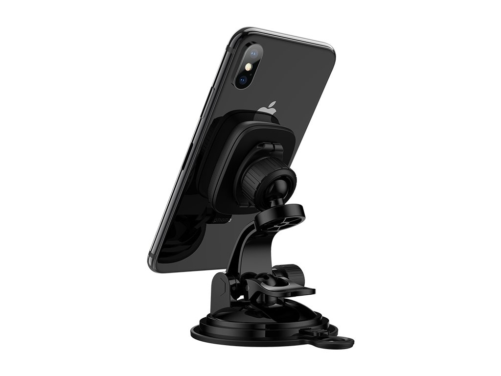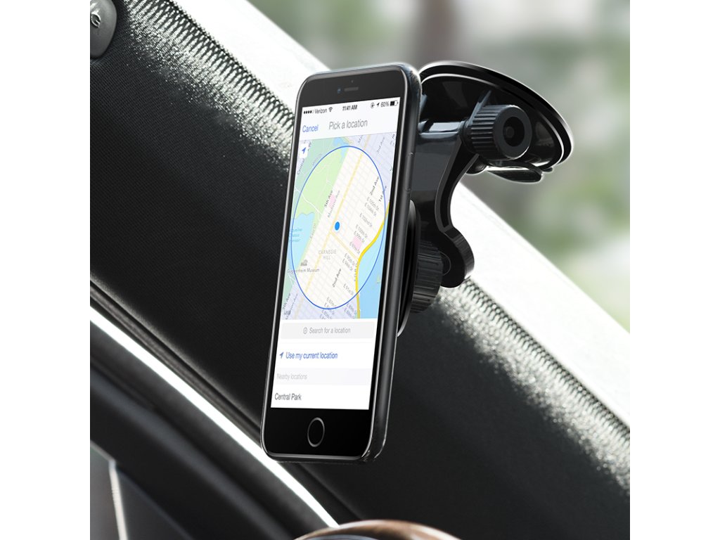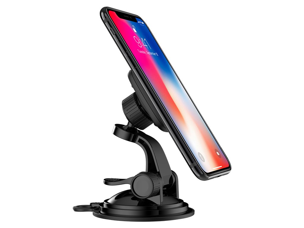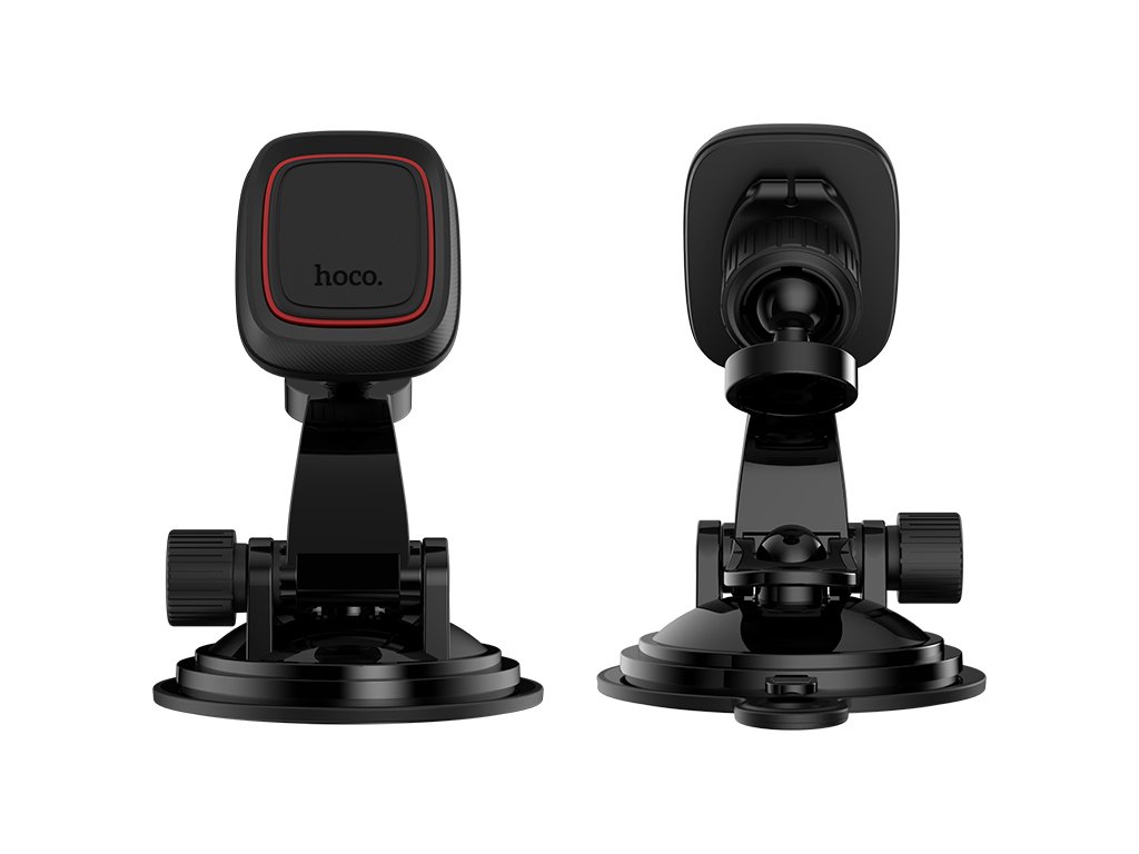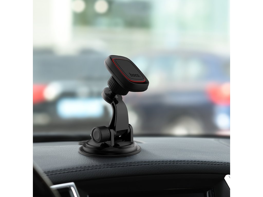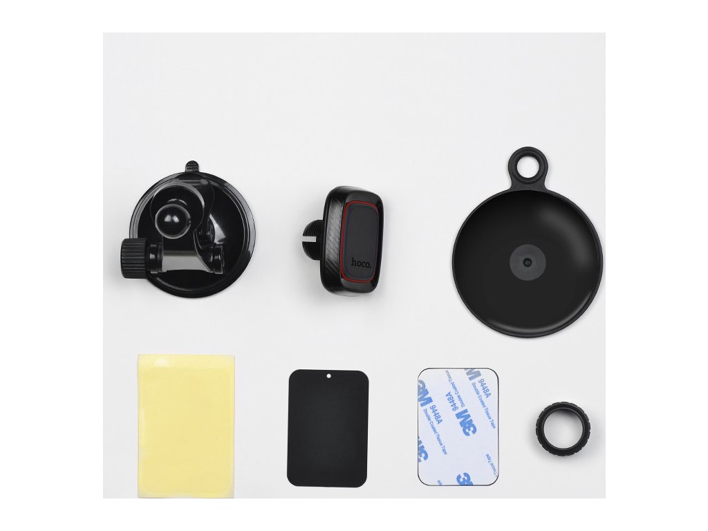 Magnetický držák na iPhone do auta, firmy HOCO, černé barvy. S pomocí tohoto držáku se dá pohodlně používát navigace v autě, telefon pevně drží za pomocí silného magnetu a nevypadáva. Zachycuje se na čelním skle. Váha: 110g.