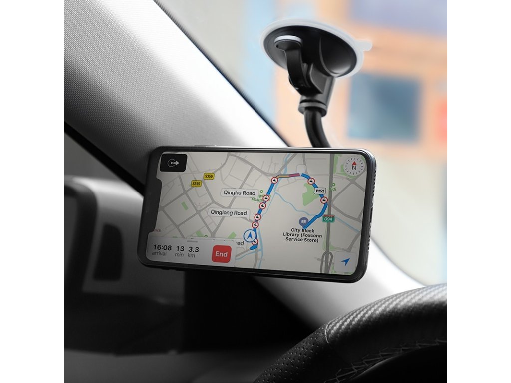 Držák do auta umístíte na palubní desku nebo přední okno. Spodní přísavka se uchytí na rovnou plochu, doporučujeme ji předtím omýt a osušit.