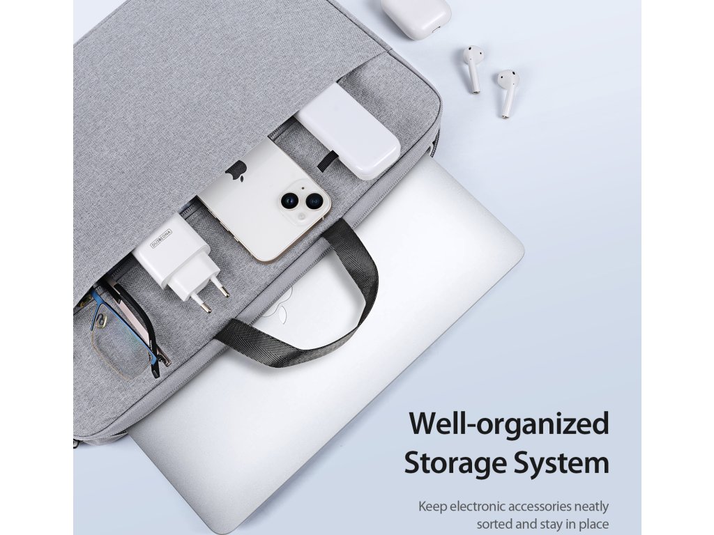 Brašna má dvě kapsy. Hlavní pojme samotný počítač, který je uložen do měkké podšívky a nemůže se tak poškrábat nebo jinak poškodit. Do druhé menší přihrádky pak jde umístit sešity, telefon, powerbanku nebo další středně velké příslušenství.