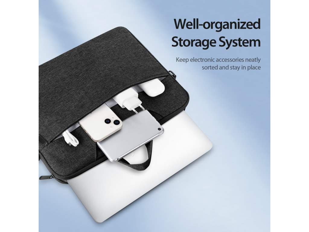Brašna na MacBook skýtá spoustu prostoru na uložení dalšího příslušenství. Kromě hlavní kapsy na počítač jsou k dispozici i dvě postranní. Je v nich dostatek místa na uložení myši, kabelů, menší klávesnice nebo psacích potřeb. Menší pak může posloužit pro vložení tabletu. Obě kapsy jsou uzavíratelné zipem.