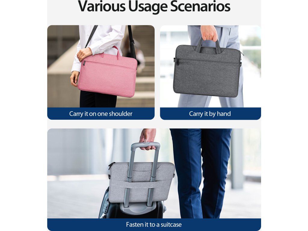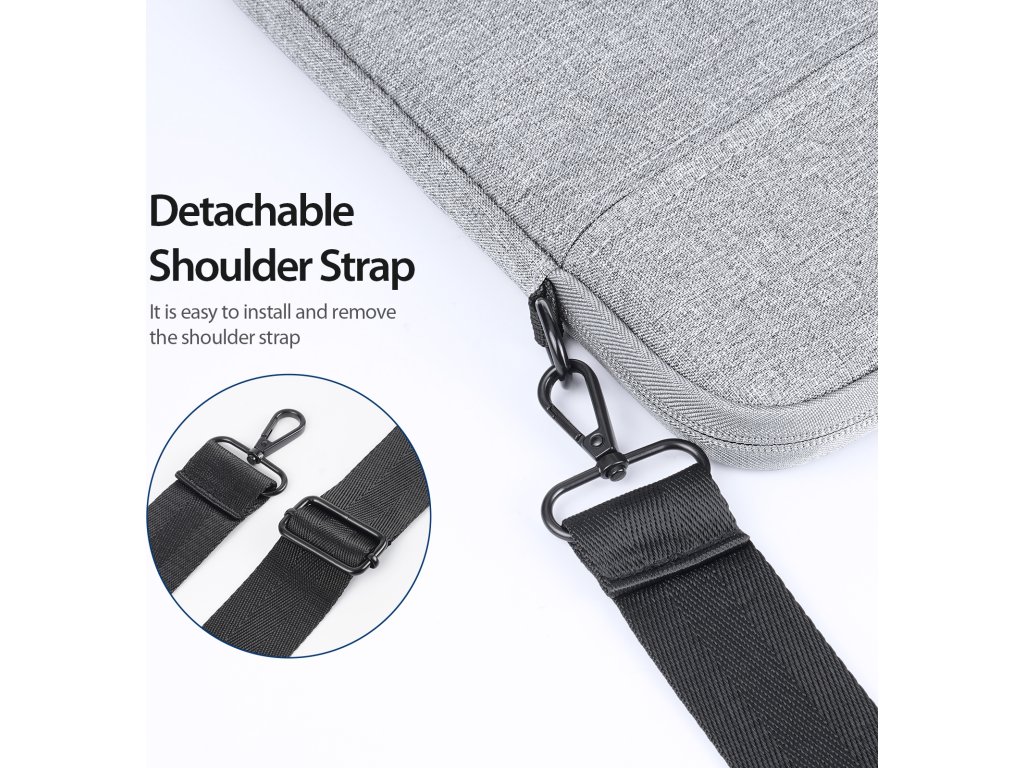 Taška pro notebook má na vrchu ucha pro pohodlné držení a přenášení. To se hodí pro menší cesty a krátké trasy. U delšího přesunu oceníte dlouhý popruh opatřený měkkou ploškou, kterou si nasadíte na rameno. Takto lze přenášet počítač i několik hodin denně.