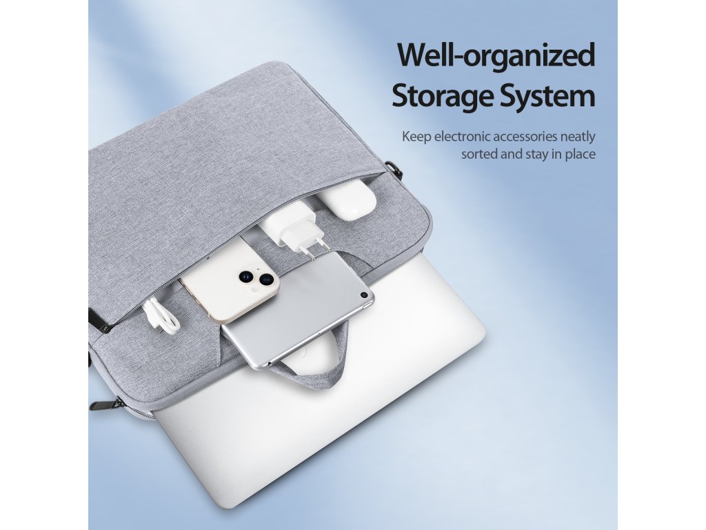 Brašna na notebook skýtá spoustu prostoru na uložení dalšího příslušenství. Kromě hlavní kapsy na počítač jsou k dispozici i dvě postranní. Je v nich dostatek místa na uložení myši, kabelů, menší klávesnice nebo psacích potřeb. Menší pak může posloužit pro vložení tabletu. Obě kapsy jsou uzavíratelné zipem.