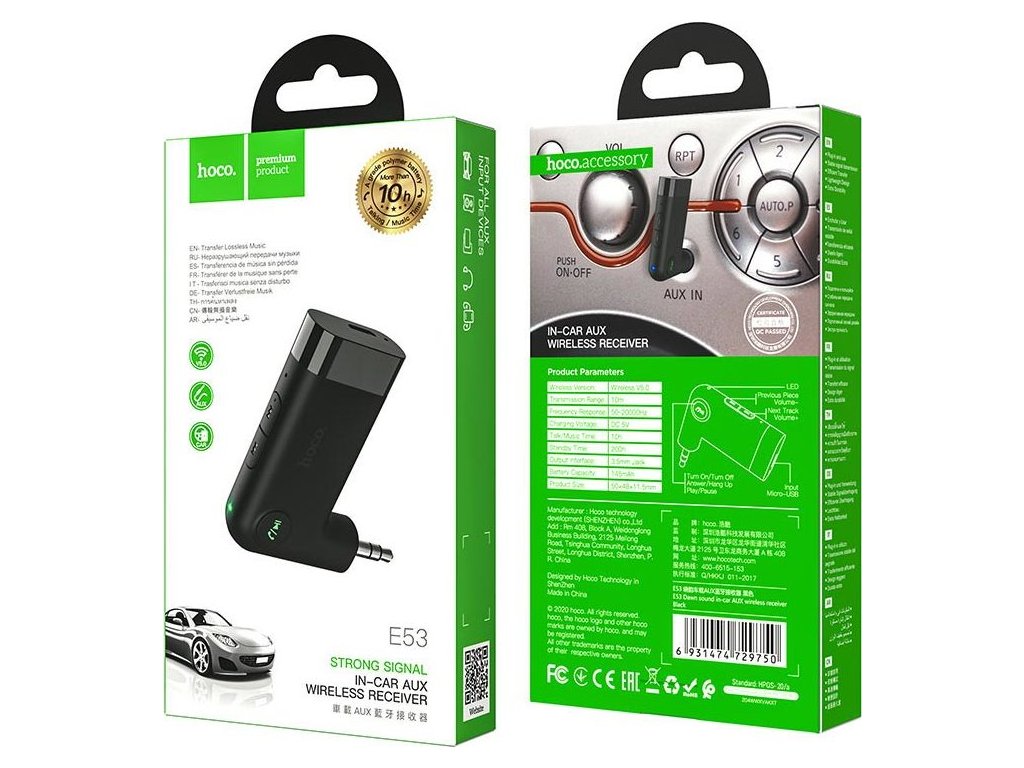 Bluetooth audio přijímač do auta Hoco E53 funguje s každým audio zařízením, které má 3,5mm jack konektor. Jen ho zapojíte a bezdrátově pouštíte hudbu z telefonu nebo tabletu.