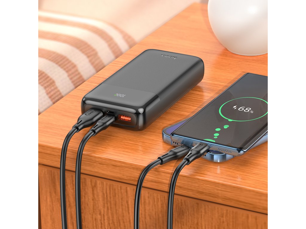 Externí baterie Hoco J121A Fast není žádný mrňous a důvodem je velká kapacita 20 000 mAh. Díky tomu můžete mnohonásobně nabít svůj telefon nebo tablet. Vedle těchto zařízení navíc nebude dělat rozhodně ostudu a nabíjet můžete rovnou 3 zařízení současně. Potěší i displej zobrazující zbývající energii powerbanky v procentech.