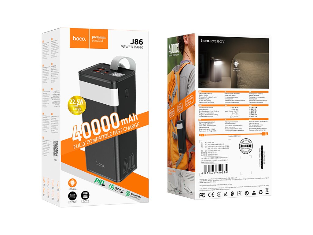 Externí baterie Hoco J86 se honosí obří kapacitou 40 000 mAh. Je jako stvořená pro ty, kteří potřebují maximální výdrž na dlouhou dobu. Přehled o nabití usnadňuje LED displej. Na předním boku jsou celkem 4 porty, které zvládnou dobíjet v jednu chvíli až 3 zařízení a dobití powerbanky můžete provést dvěma různými konektory. A když nepotřebujete nabíjet, powerbanka se může proměnit v LED lampičku.