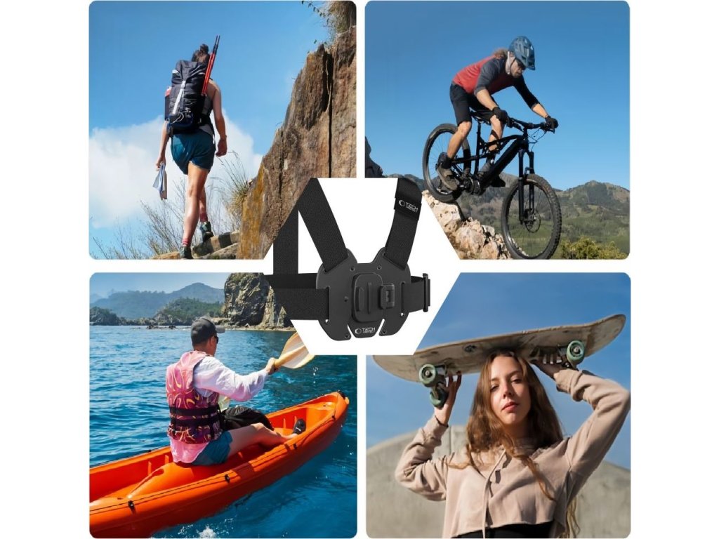 Hrudní držák pro kameru GoPro Tech-Protect GA100 je ideální příslušenství pro každého, kdo chce natáčet nezapomenutelné zážitky z jedinečné, dynamické perspektivy, a přitom mít ruce zcela volné. Díky nastavitelné a flexibilní čelence se držák pohodlně přizpůsobí hlavě nebo helmě, což jej činí perfektním pomocníkem při snowboardingu, horolezectví, sjíždění divoké vody nebo trekingu.