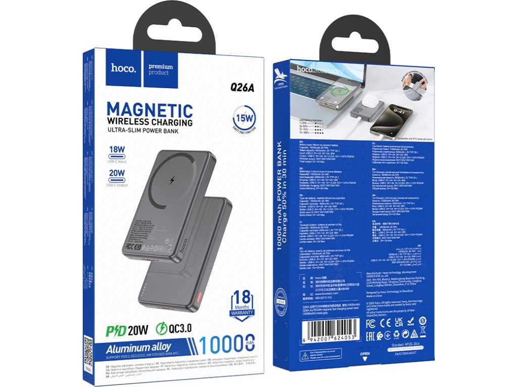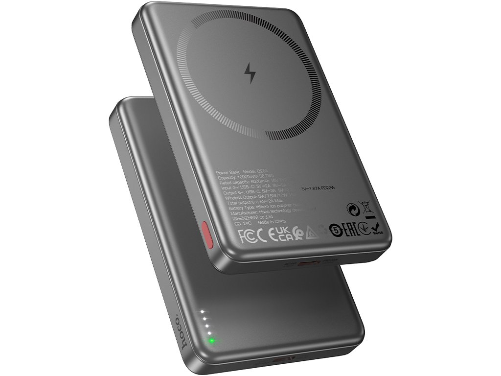 Powerbanka s MagSafe pro iPhone Hoco Q26A je krásná na první pohled a má vše, co od dnešní externí baterie očekáváte. Disponuje kapacitou 10000 mAh, nabídne moderní USB-C nabíjecí port i magnetické dobíjení MagSafe. To ocení zejména uživatelé iPhonů.