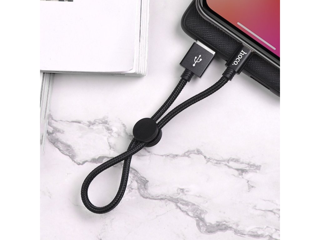 Kabel lighting na zařízení se systémem iOS značky HOCO, černé barvy. Je velmi krátký (pouze 25 cm), určen pro nabíjení za powerbanky nebo pro přenos dat.