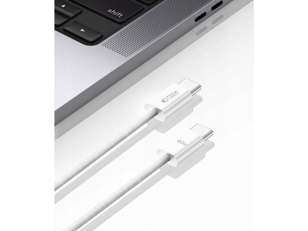 Kabel USB-C na USB-C, firmy Tech-Protect, bílé barvy s elegantním vzhledem. Tento kvalitní kabel s výstupem 3A umožňuje rychlé nabíjení a přenos dat z počítače na vaše vašeho zařízení. Je vyroben z kvalitního materiálu.