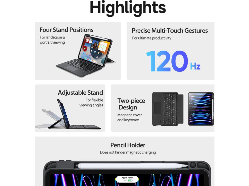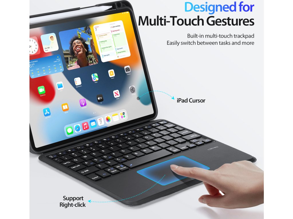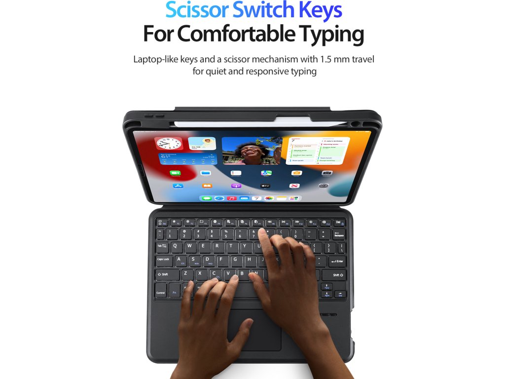 Trackpad pod klávesnicí podporuje vícedotyková gesta, takže vám půjde práce pěkně od ruky, podobně jako na MacBooku. A aby bylo používání ještě pohodlnější, jednotlivé klávesy jsou vybavené nůžkovým mechanismem se zdvihem kláves 1,5 mm pro tiché a citlivé psaní.