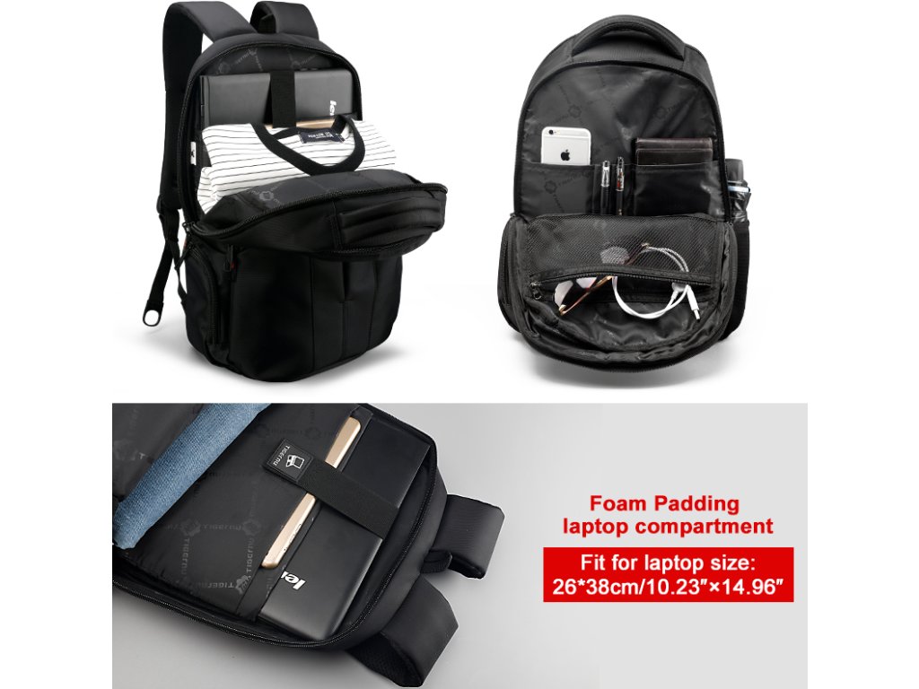 Batoh na notebook Tigernu nabízí dostatek prostoru na transport vašeho pracovního zařízení s potřebným příslušenstvím. Šikovně řešený prostor slouží k bezpečnému uložení počítače do zadní části, kde je uchycen ještě popruhem na suchý zip. K němu vměstnáte například i tablet, sešity a další příslušenství jako třeba powerbanky, nabíječky nebo kabely. Přední kapsa je určena pro malé předměty, které rychle z batohu vyndáte. Obsahuje i síťovanou přihrádku.