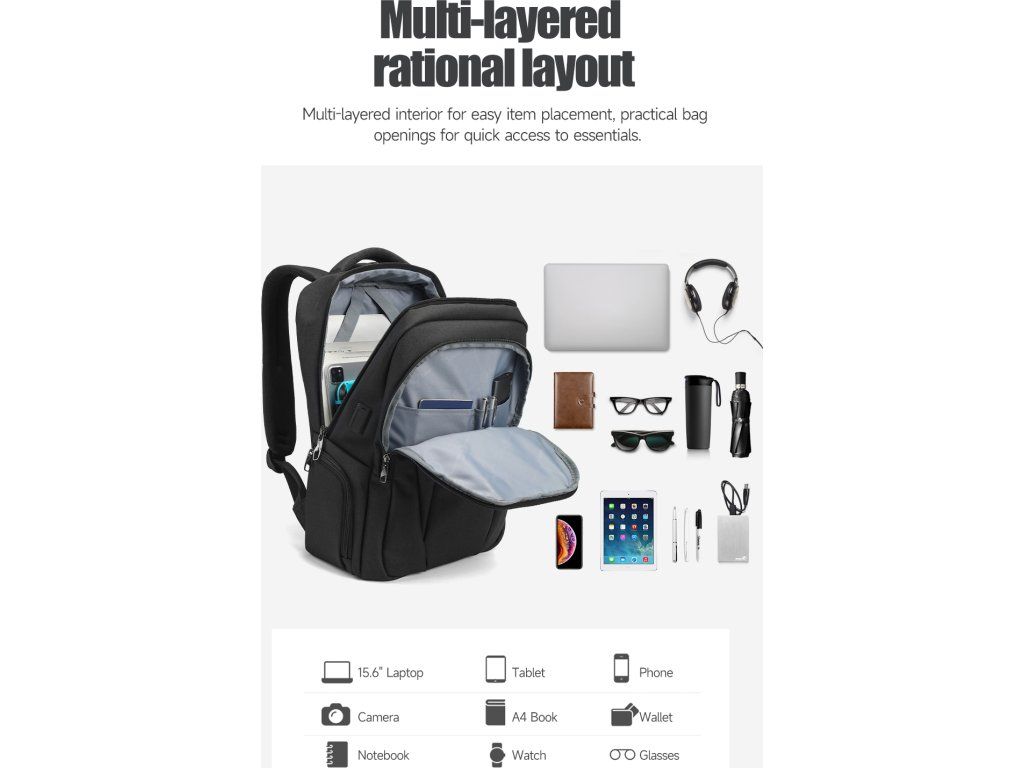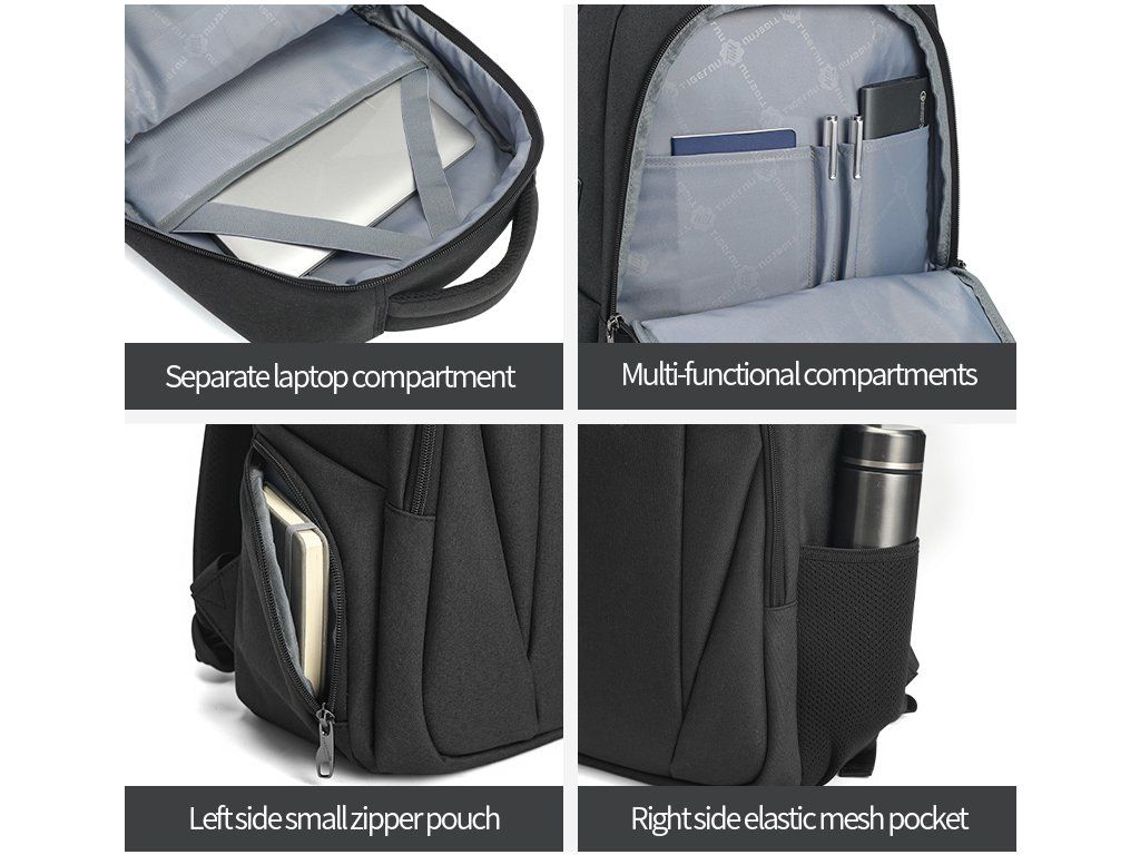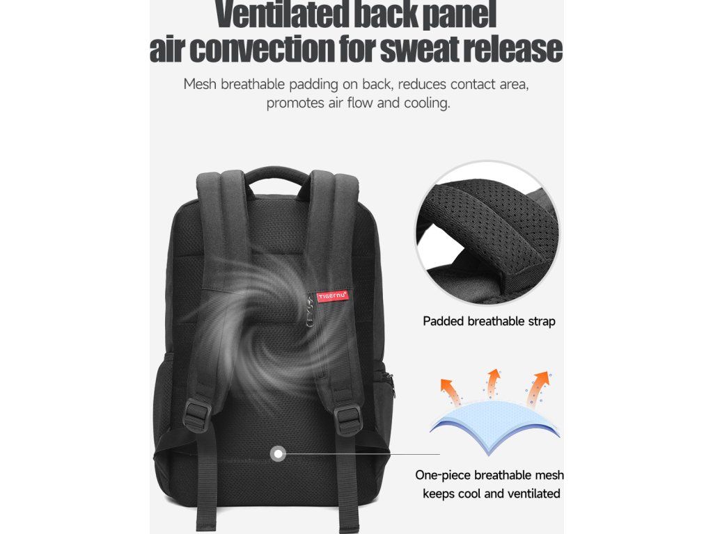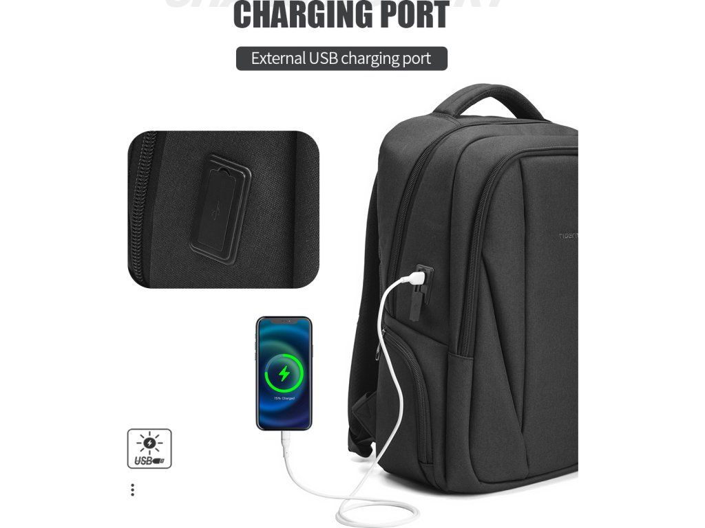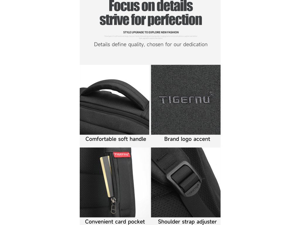 Batoh Tigernu je vynikající volbou, jak si uložit na cesty všechny své věci. Notebook je bezpečně umístěn v zadní části batohu v největší kapse. K němu můžete přihodit velká sluchátka, něco na čtení a další věci, které se vám budou na cestu hodit. Vpředu je pak menší kapsa, která má v sobě několik přihrádek a je tak vhodná pro uložení psacích potřeb, cestovních dokladů a jiných drobnějších věcí. Pod ní je ještě jedna menší, kam umístíte třeba menší tablet nebo telefon.
