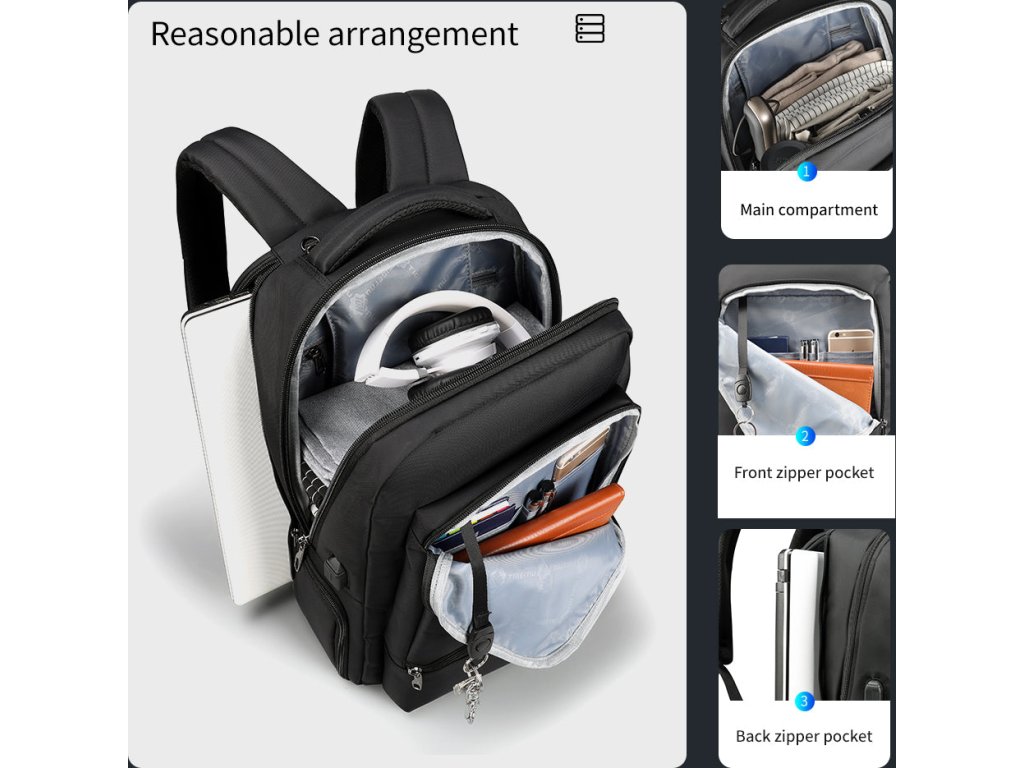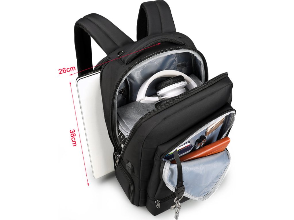 Batoh pro notebook Tigernu nabízí dost prostoru na přesunutí vašeho pracovního zařízení nebo školních věcí a to i s potřebným příslušenstvím. Bude se hodit na všechny příležitosti a uvnitř je více místa než na první pohled čekáte. Jedna velká kapsa slouží k bezpečnému uložení počítače a je separovaná od ostatních, takže se zařízení nepoškodí. Prostřední největší kapsa pojme spoustu doplňků jako jsou powerbanky, nabíječky nebo sešity, klávesnice nebo myš. Po otevření kapsy budete mít k dispozici mnoho přihrádek. Na zádech pak najdete skrytou kapsu, kterou při nasazeném batohu na zádech nikdo neuvidí. Malá kapsička na ramenním popruhu je jako dělaná pro uložení sluchátek, platební karty nebo kapesníku. Na druhém popruhu je praktické poutko na připnutí brýlí.