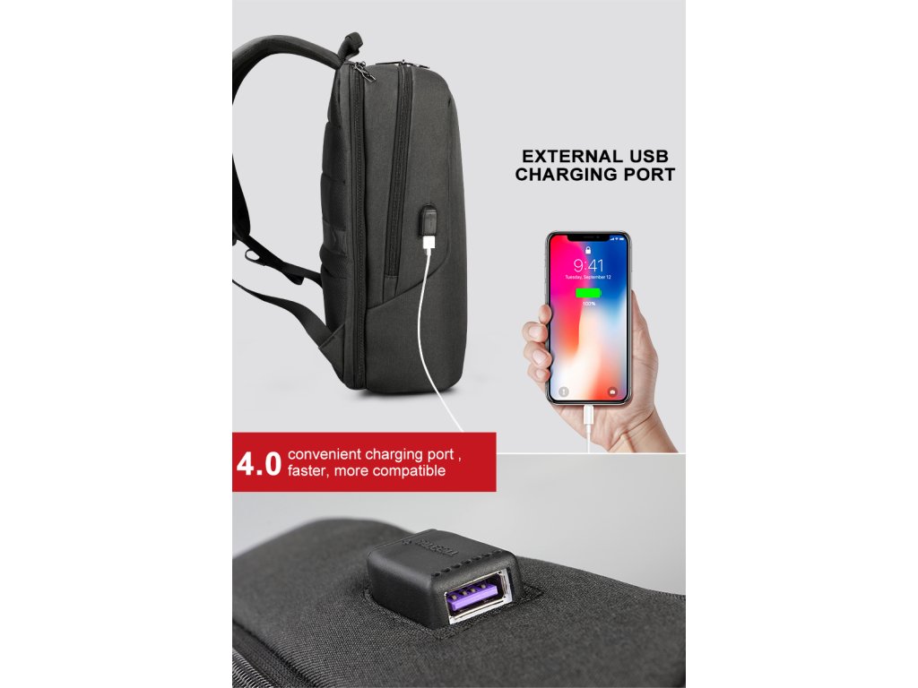 Pohodlný batoh je obdařen i nabíjecím USB portem. Ten je umístěn na boku a po připojení nabíjecího kabelu dobije váš telefon nebo tablet. Uvnitř se pak nachází propojovací kabel, který stačí zapojit do powerbanku a tu v batohu bezpečně uložit.