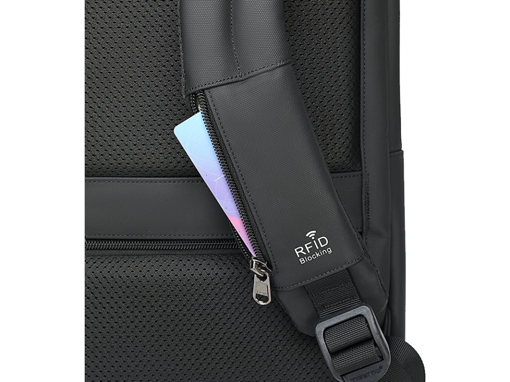 Cestovní batoh nabídne kromě obyčejných kapes a přihrádek také skrytou zadní kapsu. Ta je při nasazeném batohu na zádech pro všechny nenechavce neviditelná. Podobně nenápadně působí poutko na ramenním popruhu, kam lze zaháknout třeba brýle. Druhý popruh zase má na sobě kapsu s RFID stíněním, takže bezpečně do ní uložíte platební kartu, kterou nebude možné nikterak oskenovat.