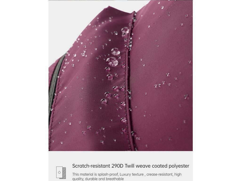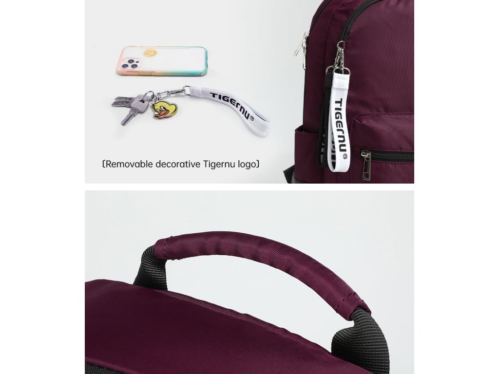 Stylový batoh nerozhází ani pořádný déšť. Vnější látka obsahuje speciální voděodolnou vrstvu 290D. Vnitřní část ramenních popruhů je zase potažena prodyšnou síťovinou, která bude odvětrávat teplo v parných dnech při nošení. Na hlavní kapsu se díky dvojitým jezdcům zipu dá připnout i bezpečnostní TSA zámek. Jezdce zipu na přední kapse zase obsahují dvě karabiny s látkovým poutkem a nápisem TIGERNU. Ty můžete odpojit a využít třeba jako klíčenku.