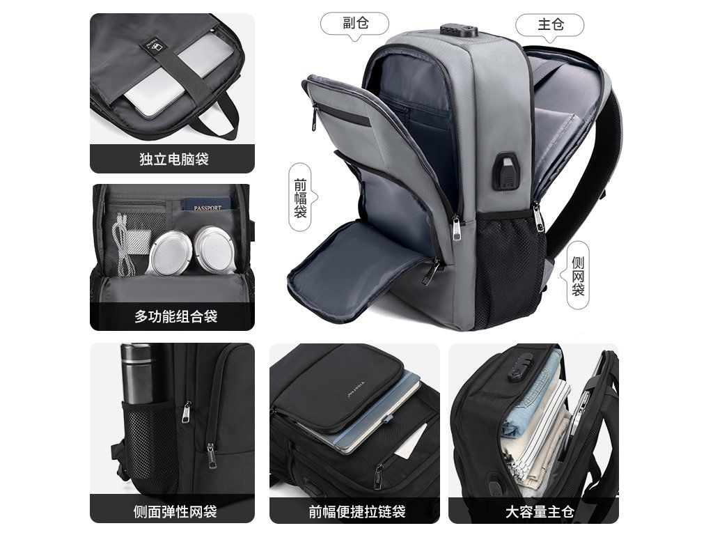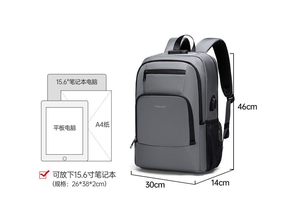 Batoh Tigernu je vynikající volbou, jak si uložit na cesty všechny své věci. Notebook je bezpečně umístěn v zadní části batohu v největší kapse. K němu můžete přihodit velká sluchátka, něco na čtení a další věci, které se vám budou na cestu hodit. Vpředu je pak menší kapsa, která má v sobě několik přihrádek a je tak vhodná pro uložení psacích potřeb, cestovních dokladů a jiných drobnějších věcí. Pod ní je ještě jedna menší, kam umístíte třeba menší tablet nebo telefon.