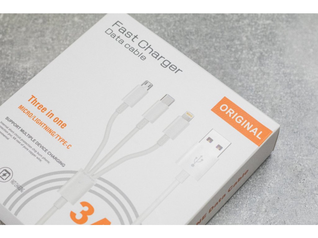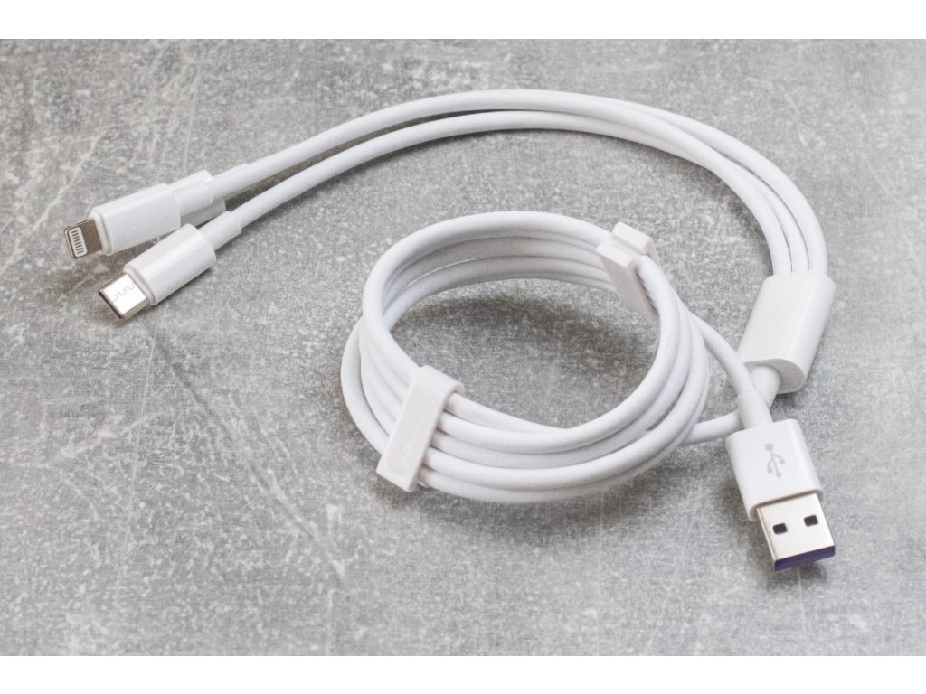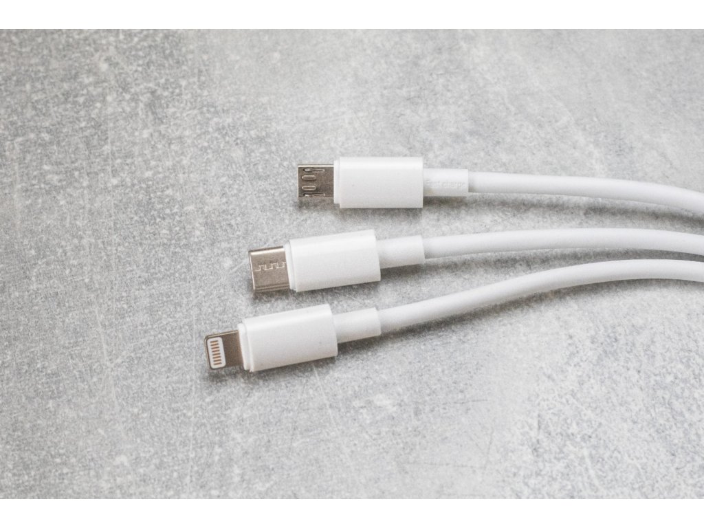 Tento set nabíjecích kabelů 3v1 v sobě ukrývá tři nabíjecí konektory (Lightning, USB-C, microUSB). Délka nabíjecího kabelu je jeden metr. Ideální na cestování.