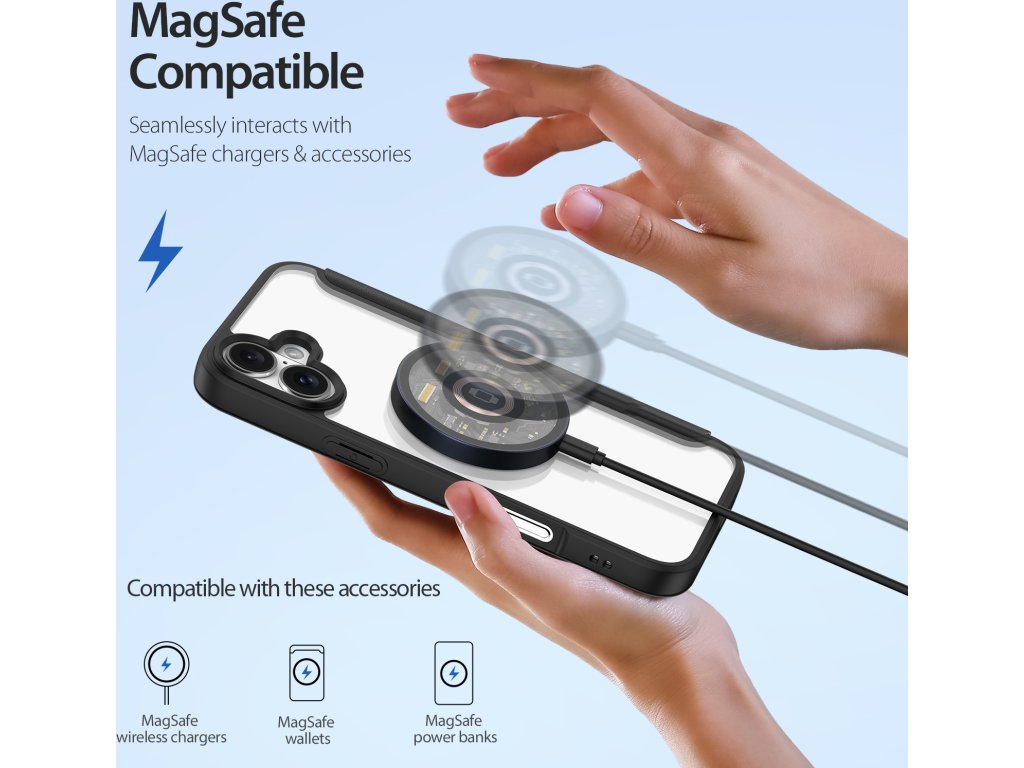 MagSafe pouzdro je vybavené 38 magnety, které jsou seskládány do kruhu. Díky tomu můžete telefon i v pouzdru nabíjet MagSafe nabíječkou, využívat MagSafe powerbanku nebo mít na zádech magneticky připevněnou MagSafe peněženku.