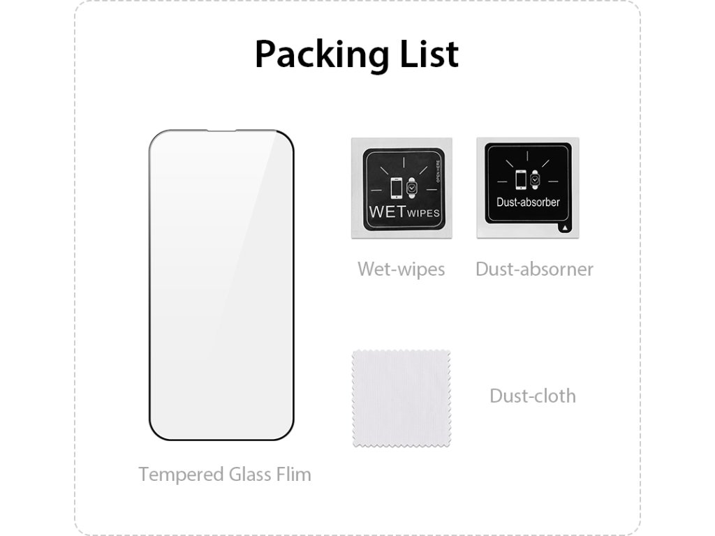 Balení obsahuje: tvrzené sklo, vlhký hadřík a mikrovláknový hadřík na vyčištění displeje.