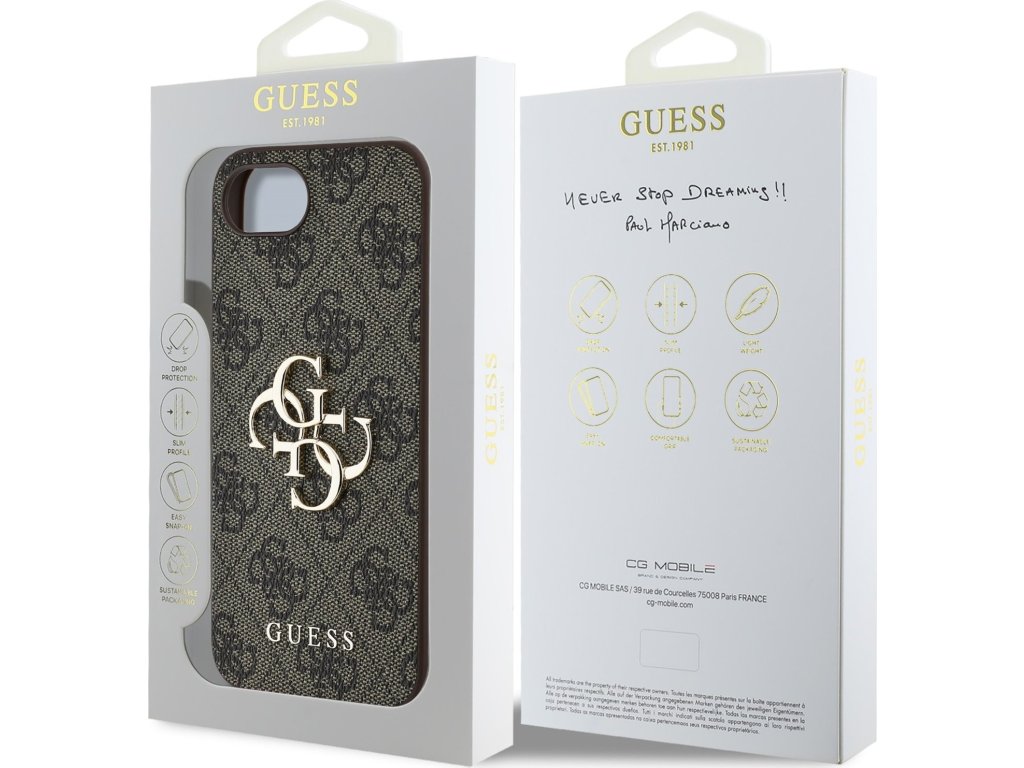 Prémiový zadní kryt Guess PU 4G Metal Logo se vyznačuje elegantním, charakteristickým 4G vzorem, doplněným o logo GUESS.