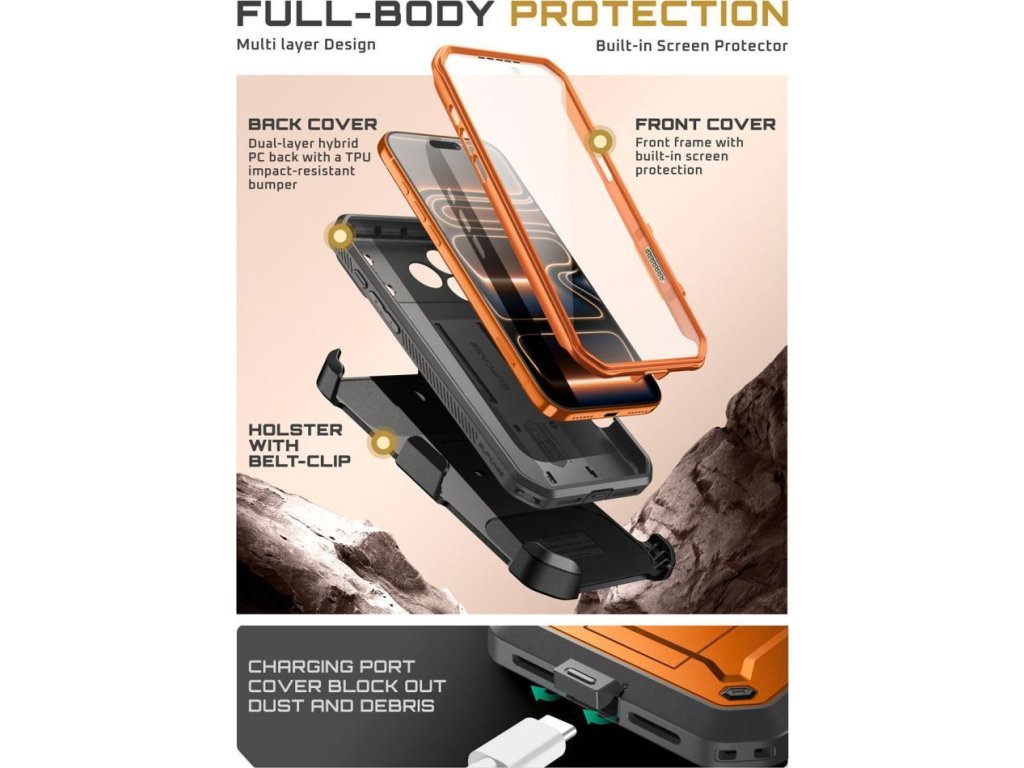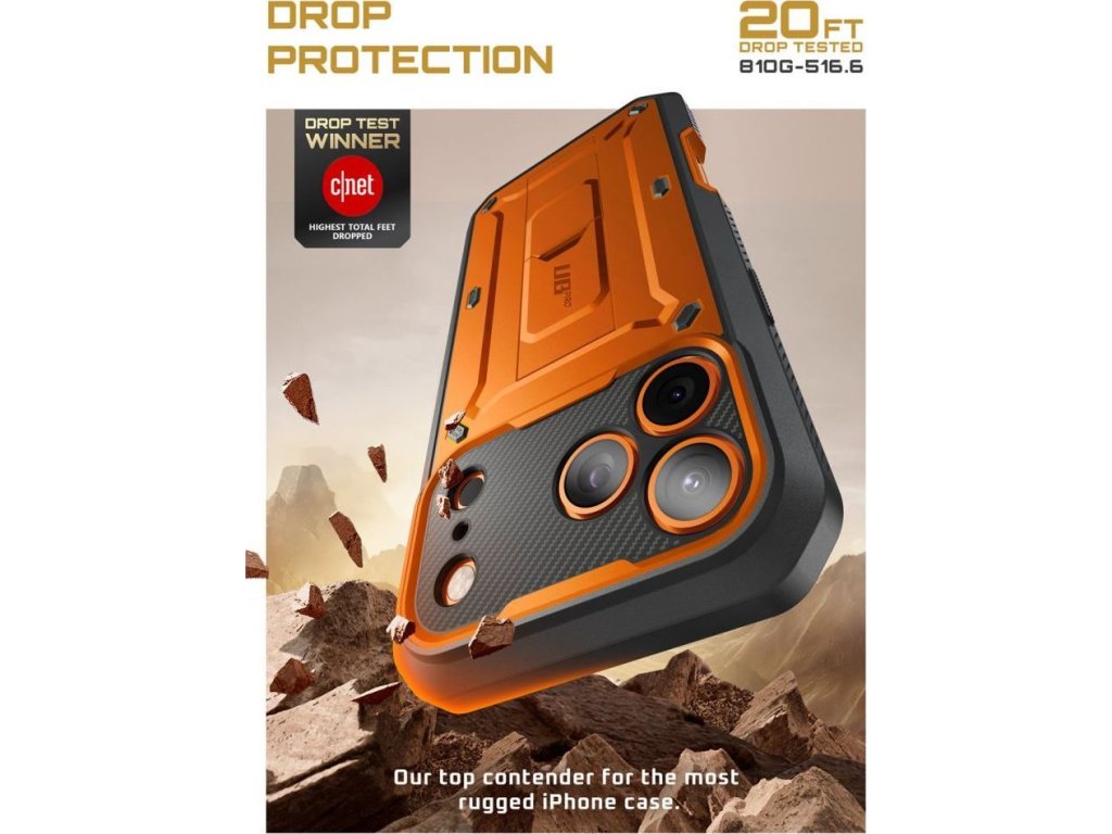 Odolný kryt na iPhone představuje kombinaci celotělové ochrany a moderního vkusu. Chrání všechny části telefonu před prachem, špínou, škrábanci a pády. Pyšní se vojenskou normou MIL STD 810G-516.6 a byl testován při pádech na zem z výšky 1,2 metru. Pokud vám tak upadne z ruky na tvrdý povrch, telefonu se nic nestane.