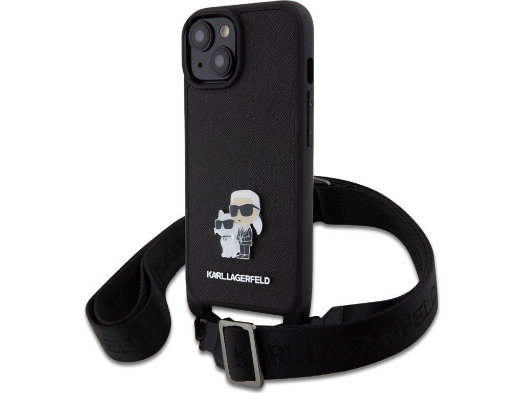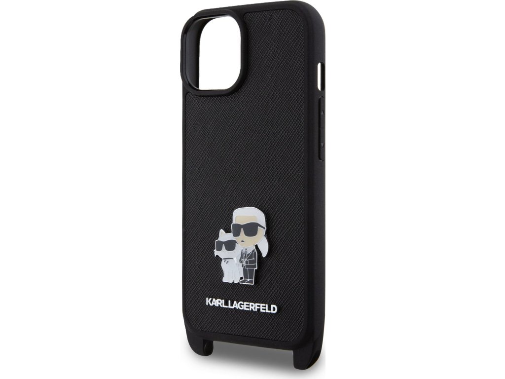 Ochranný kryt s crossbody popruhem pro iPhone 15 - Karl Lagerfeld, Saffiano Metal Karl and Choupette Black KLHCP15SSAKCPBK