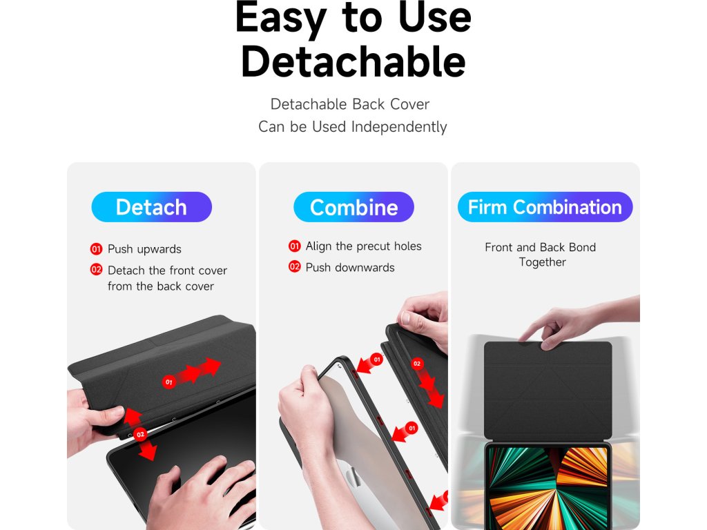 Kryt na iPad velmi rychle nasadíte a v plastovém obalu bude tablet perfektně držet. Záda jsou průhledná, takže vynikne originální design iPadu. Přední část se dá lehce skládat a při otevření se iPad automaticky rozsvítí. Zavření krytu zase displej zhasne a šetří tím energii. Navíc jde odpojit přední část a používat pouze kryt zad. Je to jen na vás.