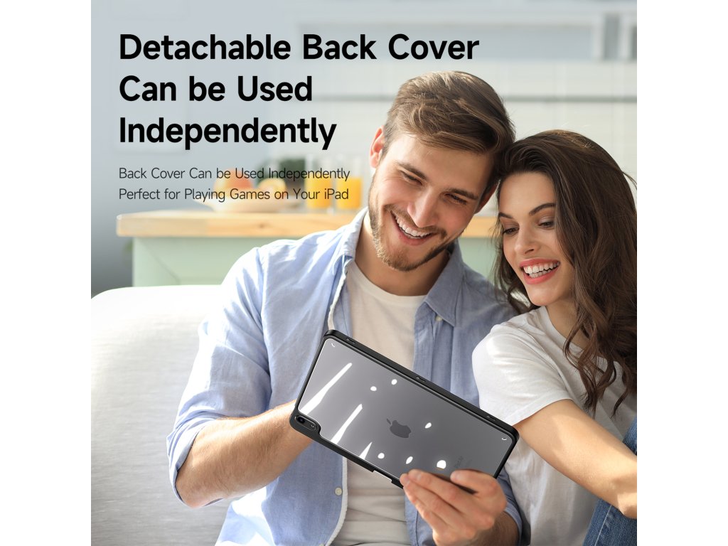 Kryt na iPad velmi rychle nasadíte a v plastovém obalu bude tablet perfektně držet. Záda jsou průhledná, takže vynikne originální design iPadu. Přední část se dá lehce skládat a při otevření se iPad automaticky rozsvítí. Zavření krytu zase displej zhasne a šetří tím energii. Navíc jde odpojit přední část a používat pouze kryt zad. Je to jen na vás.
