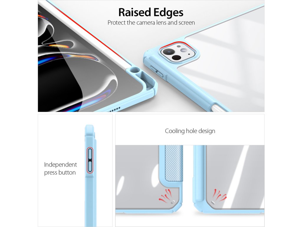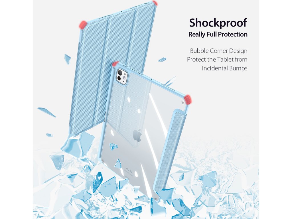 Ochranný kryt na iPad je opravdu odolný. Vyztužené rohy brání rozbití při pádech. Zadní část krytu je vyrobena z odolného plastu, který je velmi flexibilní a dokáže chytře rozvádět teplo tak, aby se zařízení v obalu nepřehřívalo. V rozích jsou chytře provrtány nenápadné otvory pro ještě lepší odvod tepla. Nemusíte se ani bát, že by se v krytu poškrábal zadní fotoaparát, protože obal přečnívá nad čočku a chrání ji. Navíc díky průhledné zadní části můžete nadále dávat na odiv krásu Apple tabletu.