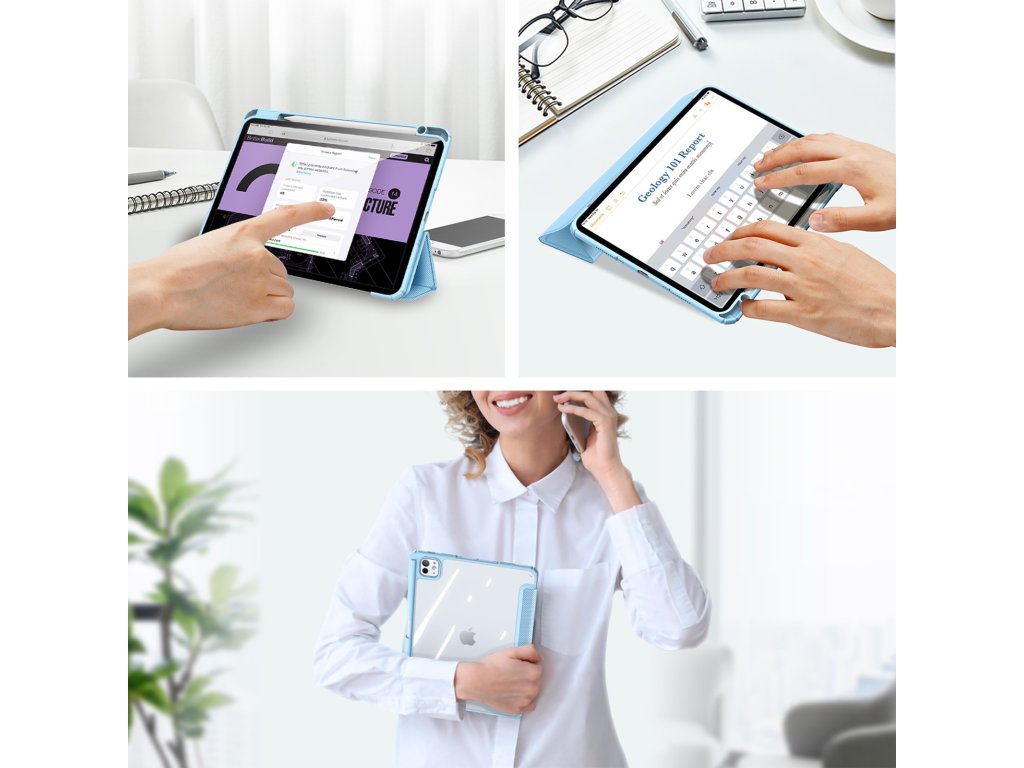 Pouzdro pro iPad Duxducis Toby zvládne zastat několik funkcí najednou. Chrání celé tělo iPadu z přední i zadní části a vyniká šikovnými vychytávkami jako jsou držák tužky Apple Pencil, inteligentní odemykání a zamykání displeje, nebo funkce stojánku.