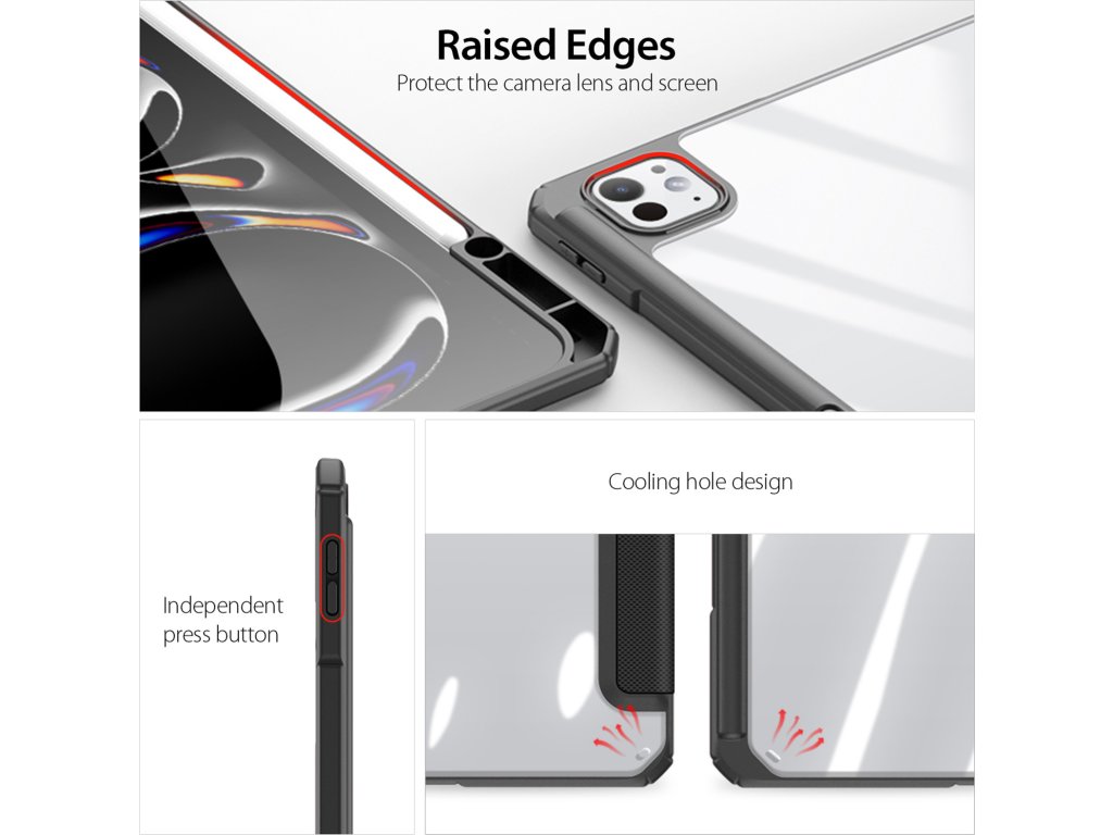 Ochranný kryt na iPad je opravdu odolný. Vyztužené rohy brání rozbití při pádech. Zadní část krytu je vyrobena z odolného plastu, který je velmi flexibilní a dokáže chytře rozvádět teplo tak, aby se zařízení v obalu nepřehřívalo. V rozích jsou chytře provrtány nenápadné otvory pro ještě lepší odvod tepla. Nemusíte se ani bát, že by se v krytu poškrábal zadní fotoaparát, protože obal přečnívá nad čočku a chrání ji. Navíc díky průhledné zadní části můžete nadále dávat na odiv krásu Apple tabletu.
