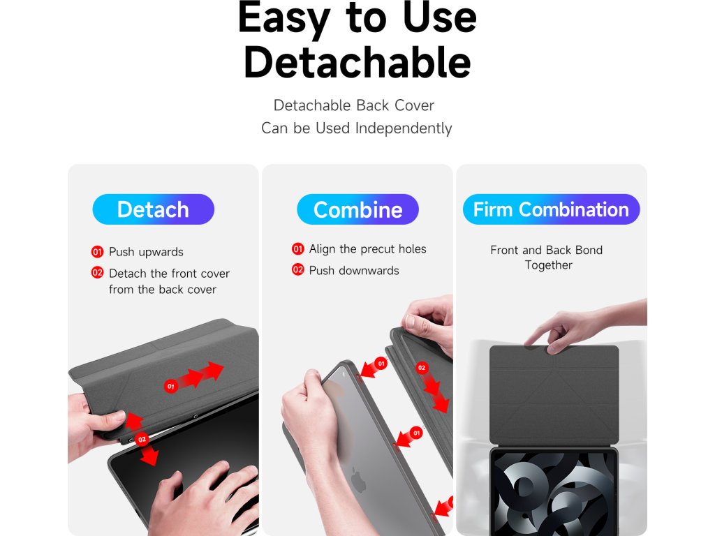 Kryt na iPad velmi rychle nasadíte a v plastovém obalu bude tablet perfektně držet. Záda jsou průhledná, takže vynikne originální design iPadu. Přední část se dá lehce skládat a při otevření se iPad automaticky rozsvítí. Zavření krytu zase displej zhasne a šetří tím energii. Navíc jde odpojit přední část a používat pouze kryt zad. Je to jen na vás.