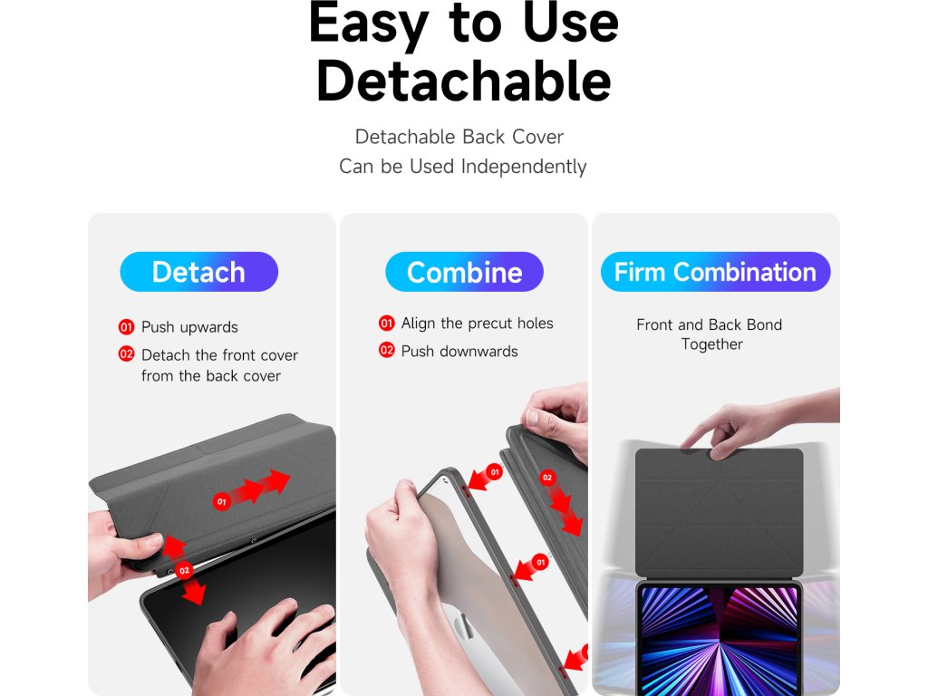 Kryt na iPad velmi rychle nasadíte a v plastovém obalu bude tablet perfektně držet. Záda jsou průhledná, takže vynikne originální design iPadu. Přední část se dá lehce skládat a při otevření se iPad automaticky rozsvítí. Zavření krytu zase displej zhasne a šetří tím energii. Navíc jde odpojit přední část a používat pouze kryt zad. Je to jen na vás.