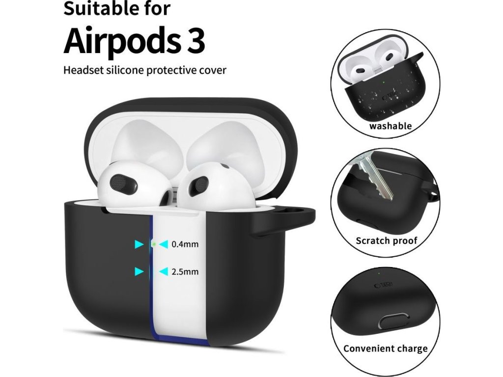Pouzdro na sluchátka AirPods 3 s karabinou je vyrobeno z tenké gumy a výborně ochrání nabíjecí krabičku před poškrábáním a zničením. Sedí přesně na AirPods 3 a i v nasazeném krytu můžete využívat funkci bezdrátového nabíjení.