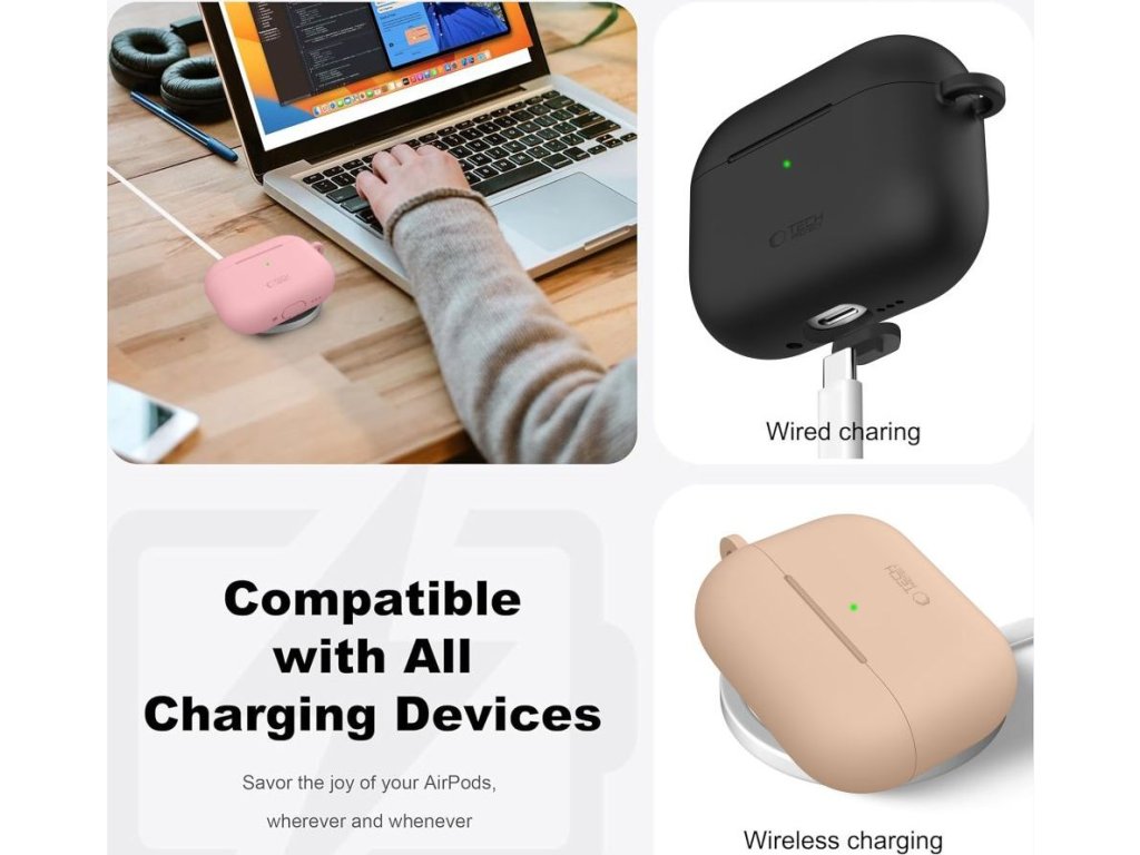 Ochranné pouzdro na AirPods Pro 3 musí perfektně na krabičce sedět. To silikonový kryt splňuje a také s ním můžete stále používat funkci bezdrátového nabíjení a nebo nabíjet kabelem, protože nabíjecí port je dostupný i při nasazeném krytu. Zároveň je na krytu malý průřez na přední straně, kterým pronikne světlo signalizační LED diody.
