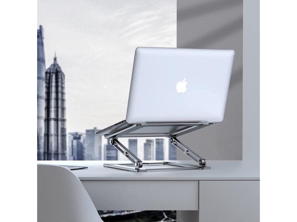 Stojan na MacBook poskytuje větší pohodlí a zlepšuje chlazení. Příslušenství má lehkou hliníkovou konstrukci s možností skládání a nastavení. To vám umožní zvednout zařízení v různých úhlech, což se projeví ve vylepšené ergonomii a zdravé poloze při práci na notebooku. Stojan lze polohovat do libovolného úhlu a optimální výšky.