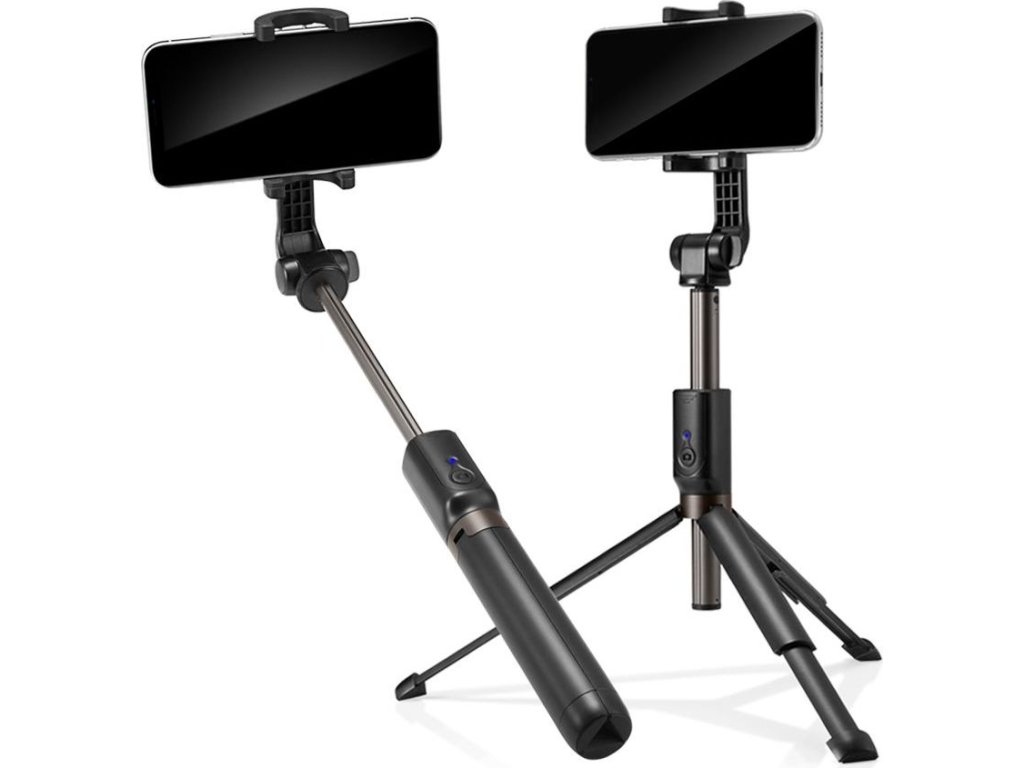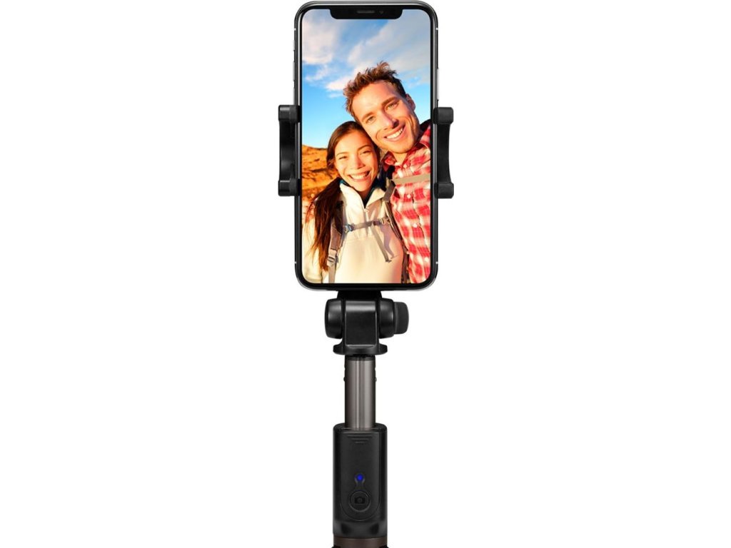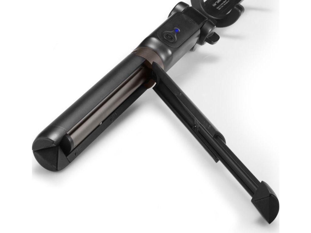 Stojánek pro iPhone je opatřen třemi nohami, které udrží stabilně selfie tyč v pozoru a s nasazeným telefonem. Nohy lze jednoduše zase složit a získat tak rukojeť pro záběry z ruky.