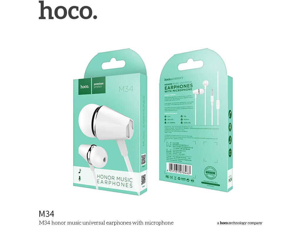 Sluchátka firmy HOCO s 3,5mm jack konektorem bílé barvy. Mají stylový a minimalistický design a k tomu dobrou kvalitu zvuku. Jsou vyrobeny z kvalitního a vysoce elastického plastu.