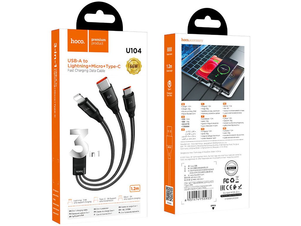 Kabel 3v1 Hoco U104 je univerzální možností, jak nabíjet různá zařízení a mít vždy po ruce odpovídající konektor. Na jednom konci je klasické USB, které zasunete do nabíječky nebo počítače. Druhý konec pak je obdařen trojicí portů, které obsahují Lightning, Micro USB a USB-C. Současně tak lze nabíjet například iPhone, iPad a starší telefon nebo jiné příslušenství.