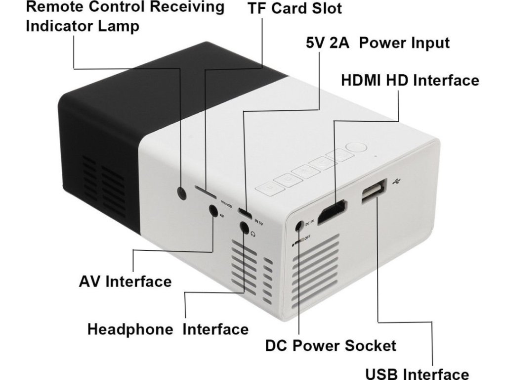 Levný projektor má mnoho způsobů, jak přes něj můžete promítat videa nebo fotografie. Do těla zařízení zapojíte sluchátka pomocí 3,5mm jack konektoru, HDMI kabel, paměťovou kartu a příslušenství s USB konektorem. Napájení je zajištěno dodávaným kabelem.